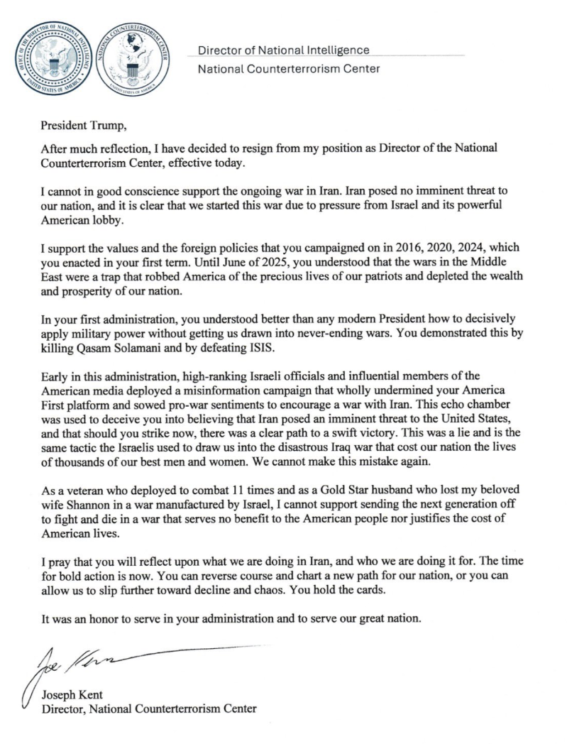 肯特是目前為止因特朗普決定對伊朗開戰而離開特朗普政府的最高級別官員,他在X上發表的給特朗普的辭職信中寫道:“我實在無法心安理得地支持正在進行中的伊朗戰爭,伊朗並未對我國構成迫在眉睫的威脅,很明顯,我們是因為以色列及其強大美國遊說團體的壓力才發動這場戰爭。”