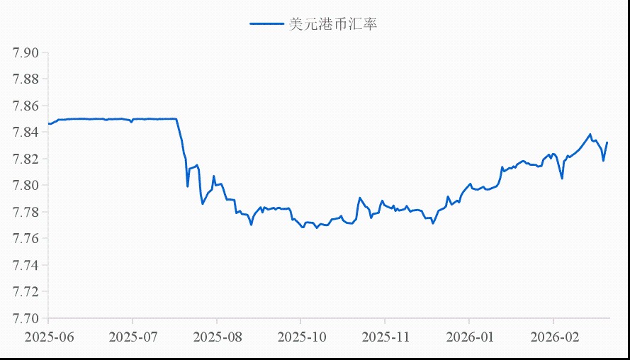 2026年Q1,Hibor與Sofr走勢背離。(圖源:東吳證券) 與此同時,港幣和美元的匯率也經歷了有趣的波動。港幣匯率在三月多次衝到7.8附近,儘管沒有達到7.75的強方兌換保證區間。但這個匯率表現,明顯強於2025年下半年的弱勢。