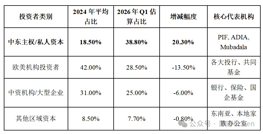 中東有充足的“增量資金”進行全球配置(圖源:東吳證券) 當前的邏輯是,中東金主們正是在分散原本高度集中在歐美的存量資產。出於對地緣政治風險(如制裁和資產凍結)的極度警惕,他們將原先配置在西方國家的頭寸,通過離岸美元渠道劃轉至香港。這種轉移是“賬面化”的,因此看到沙特和阿聯酋的本幣匯率依然堅挺,外匯儲備甚至因高油價而創下近六年新高。這意味著,進入香港的是高質量的“新增石油紅利”與“戰略轉倉”,而非被迫的“拋售套現”。 相比資金流向,更值得關心的是資金的賽道選擇。 離開中東的資金,進入香港。不僅僅是避險,也是從能源換道科技。從中東資金配置來看,高拋低吸。在石油高價兌現收益,而在恒生科技下跌30%後,嘗試建倉。 在一級市場,中東資本已成為港股IPO的“戰略壓艙石”。2026年第一季度,中東主權基金在港股IPO中的基石投資參與比例從2024年的不足20%猛增至38.8%。布局的方向包括,人工智能(AI)、商業航天及新能源等核心領域。通過投資香港上市的科技公司,換取其技術向中東轉移,服務其國內“2030願景”的去石油化轉型。