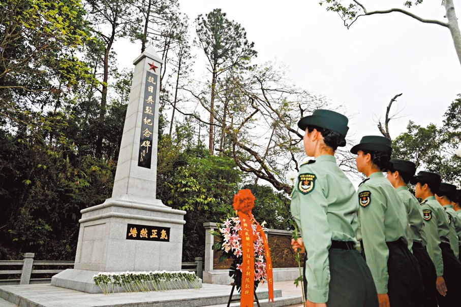 駐香港部隊官兵代表赴香港抗日英烈紀念碑開展瞻仰祭掃活動。 中國人民解放軍駐香港部隊官方微信公眾號“香江礪劍”圖片 抗日戰爭期間,中國共產黨領導的東江縱隊港九獨立大隊,是香港唯一一支成建制堅持抗戰的武裝力量。在三年八個月裡,面對日軍的殘酷統治和嚴密封鎖,港九獨立大隊的抗日誌士們團結發動香港民眾堅持頑強抵抗日軍侵略,為抗戰勝利作出了重要貢獻,書寫了中國人民抗日戰爭歷史中可歌可泣的光輝篇章。 為緬懷和紀念犧牲的革命先烈,香港社會各界分別於1951年、1989年修建了烏蛟騰、斬竹灣抗日英烈紀念碑,被國務院列入第二批、第三批國家級抗戰紀念設施、遺址名錄。 2020年,國家退役軍人事務部將劉春祥等12名龍鼓洲戰鬥中犧牲的英烈,列入第三批抗日英烈、英雄群體名錄,2023年5月,劉春祥抗日英雄群體紀念碑在香港新界屯門龍鼓灘建成揭幕。(完) 【編輯:豐悅】