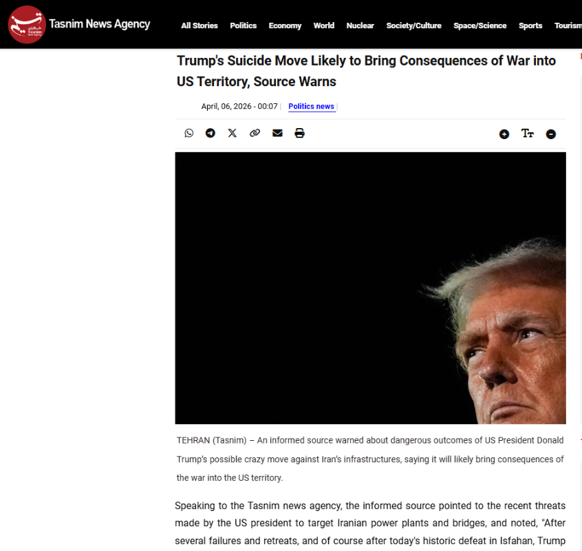 圖源:塔斯尼姆通訊社 關於川普威脅伊朗基礎設施一事,知情人士表示:“如果川普付諸行動,加劇他的瘋狂,只會讓他的失敗更加慘重!當然,他應該明白,這樣做不僅會摧毀美國在該地區的所有利益,戰爭的後果也可能波及美國本土。” “伊朗已做好不惜一切代價升級緊張局勢的準備。”消息人士指出。 據悉,伊朗武裝部隊哈塔姆安比亞中央總部司令阿蔔杜拉希周六(4月4日)回應了美國總統特朗普發出的所謂“48小時”通牒——即如果伊朗不在48小時內接受和平協議,美國將摧毀該國的關鍵基礎設施。阿蔔杜拉希強調,伊朗軍方將堅定捍衛民族權利、保護國家資產,讓侵略者付出代價。 阿蔔杜拉希表示,特朗普的威脅是“無助、慌亂、失衡且愚蠢的行為”。他還援引了特朗普在社交媒體帖子中帶有宗教色彩,“這條信息的意思很簡單,就是地獄之門將為你們(美國)敞開。” 伊朗方面周六表示,美以聯合空襲襲擊了伊朗的石化工廠,并迫使一處大型工業區人員撤離。伊朗半官方的塔斯尼姆通訊社報道稱,針對伊朗布什爾核電站周邊地區的其他襲擊造成一名安保人員死亡。塔斯尼姆通訊社還表示,該核電站的主要區域未受影響。 伊朗周末則繼續向中東大部分地區發射了導彈和無人機。迪拜當局報告稱,周六上午,一枚空中攔截導彈的碎片落在了迪拜互聯網城甲骨文公司大樓的外牆上。他們還報告說,碎片擊中了附近迪拜碼頭區的一棟建築物。沒有人員傷亡或火災報告。(完) 【編輯:錢林霞】