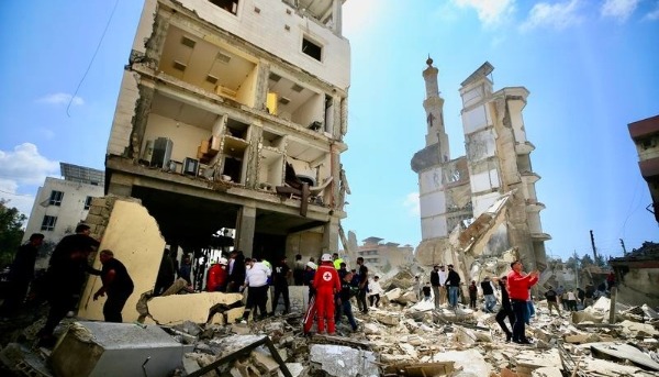 4月8日,在黎巴嫩南部西頓市,救援人員在以軍空襲損毀的建築廢墟中尋找生還者。新華社照片