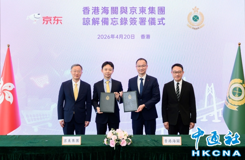 •   4月20日,香港海關助理關長(情報及調查)黃浩然(右二)與京東集團港澳台業務總經理楊肯(左二)在香港簽訂諒解備忘錄。香港海關關長陳子達(右一)和京東集團副總裁兼首席經濟學家沈建光博士(左一)見證簽署儀式。 香港中通社圖片