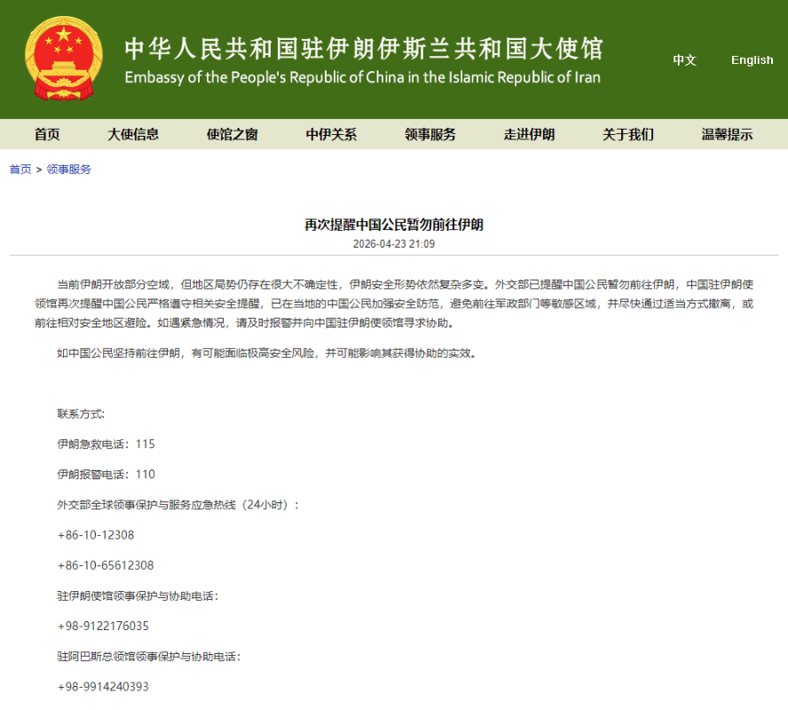 中國駐伊朗大使館截圖 大使館表示,中國外交部已提醒中國公民暫勿前往伊朗,中國駐伊朗使領館再次提醒中國公民嚴格遵守相關安全提醒,已在當地的中國公民加強安全防範,避免前往軍政部門等敏感區域,並盡快通過適當方式撤離,或前往相對安全地區避險。如中國公民堅持前往伊朗,有可能面臨極高安全風險,並可能影響其獲得協助的實效。 日前,伊朗民航組織宣布,伊朗東部空域的航線已對國際航班開放。伊朗各機場的航班運營將逐步恢復,以向伊朗民眾提供客運服務。 23日早前,伊朗馬漢航空發布公告,宣布將恢復伊朗往返中國航線客運航班。 公告顯示,自4月26日起,馬漢航空將逐步恢復伊朗往返中國的客運航班運營,涉及北京、上海、廣州往返德黑蘭航線。(完) 【編輯:彭玉婷】