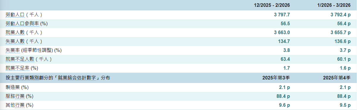 2026年1-3月最新勞動人口統計數字。(圖源:香港特區政府統計處網站) 統計處指出,與2025年12月至2026年2月比較,在2026年1月至3月期間,各行業的失業率(不經季節性調整)變動不一,其中住宿服務業有較明顯的跌幅。就業不足率方面,下跌主要見於地基及上蓋工程業。 數據顯示,總就業人數由2025年十二月至2026年二月的3,663,000人,下跌至2026年1月至3月的3,655,700人,減少約7,300人。同期的總勞動人口亦由3,797,700人下跌至3,792,400人,減少約5,300人。失業人數(不經季節性調整)由2025年12月至2026年2月的134,700人上升至2026年一月至三月的136,600人,增加約1,900人。同期的就業不足人數則由63,400人下跌至60,100人,減少約3,300人。 經濟增長為勞動市場提供支持 勞工及福利局局長孫玉菡評論最新失業數字時表示:“2026年一月至三月經季節性調整的失業率較上一個三個月期間進一步微跌0.1個百分點至3.7%。與此同時,就業不足率亦微跌0.1個百分點至1.6%。同期勞動人口和總就業人數輕微下跌。” 展望未來,孫玉菡說:“香港經濟持續增長應會為整體勞動市場提供支持。政府會繼續密切觀察地緣政治局勢的發展,並評估對勞工市場的潛在影響。” 據統計局資料資料,失業和就業不足的統計數字,是根據持續進行的“綜合住戶統計調查”結果而編製。當中,就業人口涵蓋所有僱主、自營作業者、僱員(包括全職、兼職及散工等)和無酬家庭從業員。而按行業(或職業)劃分的失業人士是按其以前從事的行業(或職業)劃分。2026年1-3月的統計調查所用的樣本,是通過一個根據科學方法設計的抽樣系統選出,包括約25,000個住戶,共約66,000人,以代表本港人口的情況。 (完) 【編輯:錢林霞】