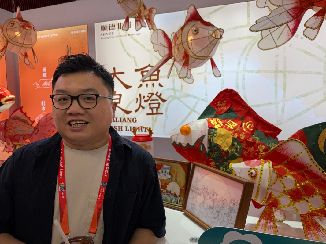 在第139屆廣交會二期B區,記者在展品中見到了順德非物質文化遺產——“大良魚燈”和“雙皮奶”,充滿中國傳統韻味的展台吸引眾多外商駐足。“我理解‘非遺’的概念,可以給我講講魚燈的故事嗎?”一位來自巴西的外商問道。佛山市順德區政協委員、大良魚燈協會會長劉鏗向外商講解大良魚燈文化:“順德人從北宋末年就開始用桑基魚塘養魚,塘基種桑-桑葉餵蠶-蠶糞養魚,魚讓順德人生活富足,也更喜歡吃魚,做魚就更厲害,所以順德人愛魚燈,魚在中國文化里也是富足的象徵。”