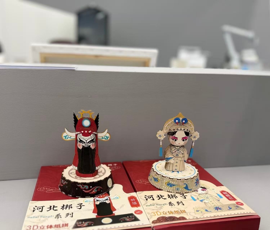 “製作成手工紙插的材料包由消費者自己動手完成組裝,在手工製作擺件過程中,通過花臉、花旦、小生的代表人物鐘馗、王寶釧、田玉川的不同造型,能深入了解河北梆子經典劇目中的人物故事、服飾特點等,完成對中國文化的深度體驗。”王宣介紹說。