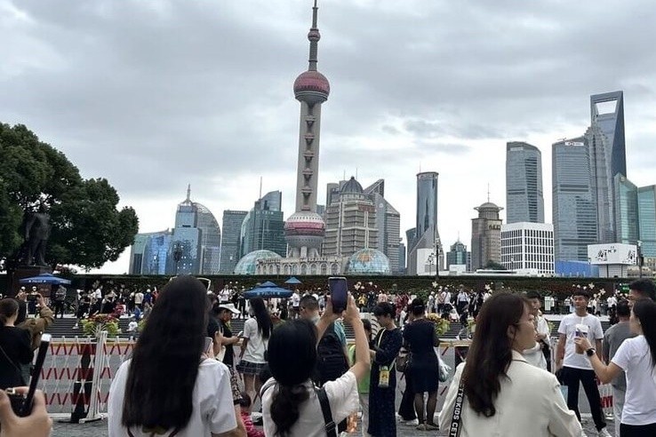圖為遊客在上海南京東路徒步區拍照留念。台灣“中央社”圖片