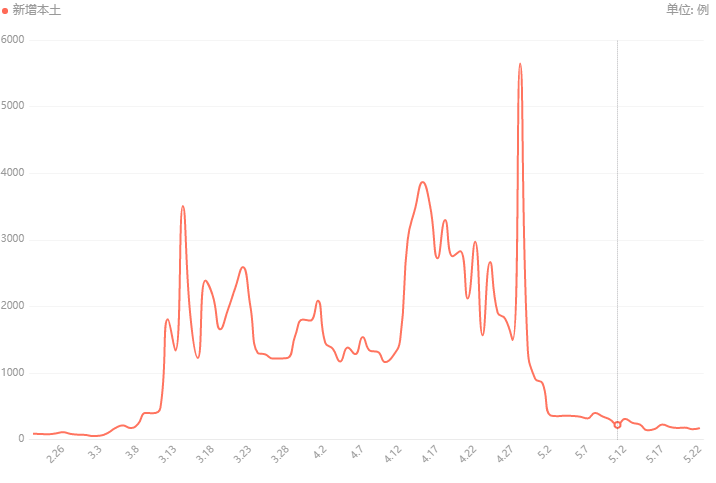 中國內地連續兩日新增本土感染總數降至1千以下香港新聞網5月23日電 據中國國家衛健委網站消息,5月22日,中國內地報告新增新冠肺炎確診病例187例。其中境外輸入病例13例;本土病例174例。新增本土病例中,包括北京83例,上海55例,天津32例,四川2例,遼寧和福建各1例。新增本土無症狀感染者628例。上海新增本土死亡病例1例。 綜合比對最近7日國家衛健委公佈的數據,內地疫情新增確診病例和無症狀感染者總數,已連續兩天降至一千例以下。新增確診病例從4月28日的最高點5646例,連續24日持續下降,從趨勢圖可見,內地此波本土疫情拐點初現。