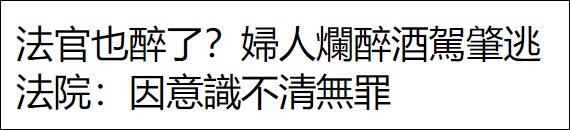 台灣女子酒後肇事逃逸,法院判無罪:她意識不清有酒駕前科、再次酒駕並連環撞車,在撞傷了別人的情況下還逃逸,如何處理?台灣法院:存在公共危險罪,但肇事逃逸不成立,畢竟“喝太多有可能意識不清……”近日,這樣一起案件在島內引發群嘲,有網民表示,“看來,以後要喝就得喝成這樣,罪才不會太重”。