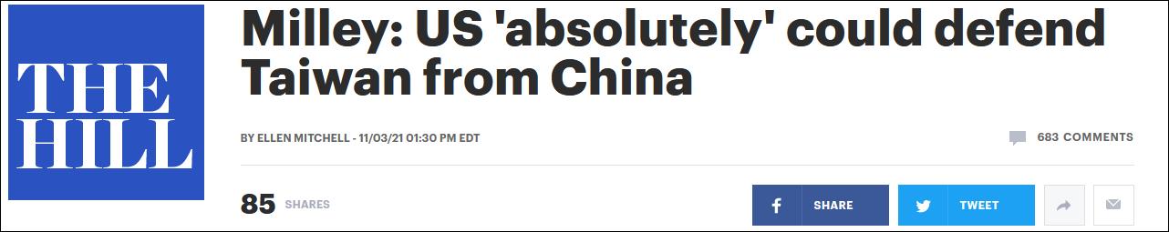 《國會山報》:米利稱美國絕對有能力保衛台灣 米利是在參加阿斯彭安全論壇(Aspen Security Forum)時拋出此番言論的。面對主持人提問“是否認為中國大陸將在近期對台採取行動”時,米利回答說這有關對“近期”一詞的定義。“根據我的分析,我不認為(中國大陸對台採取行動)可能在不遠的未來發生,即6個月、12個月或許是24個月這樣的時間窗口。” “話雖如此,但中國大陸正在毫不含糊地建設建設能力,以便在未來某個時候為領導人提供這種選項。”米利緊接著補充稱,“不遠的將來可能不會發生什麽,也可能什麽都會發生。” 在被問到“美國是否有能力保衛台灣時”,米利稱,“我們絕對有能力在世界範圍內做各種事情,如有需要也包括(‘保衛台灣’),這一點是毫無疑問的。” 《美國新聞與世界報道》周刊認為,這些言論表明米利並不認同中美正滑向衝突的假設,似乎是有意緩和外界炒作的這種說法。 在會上,米利還回應了關於美國在台灣問題上“戰略模糊”政策以及中國大陸發展高超音速武器的問題。