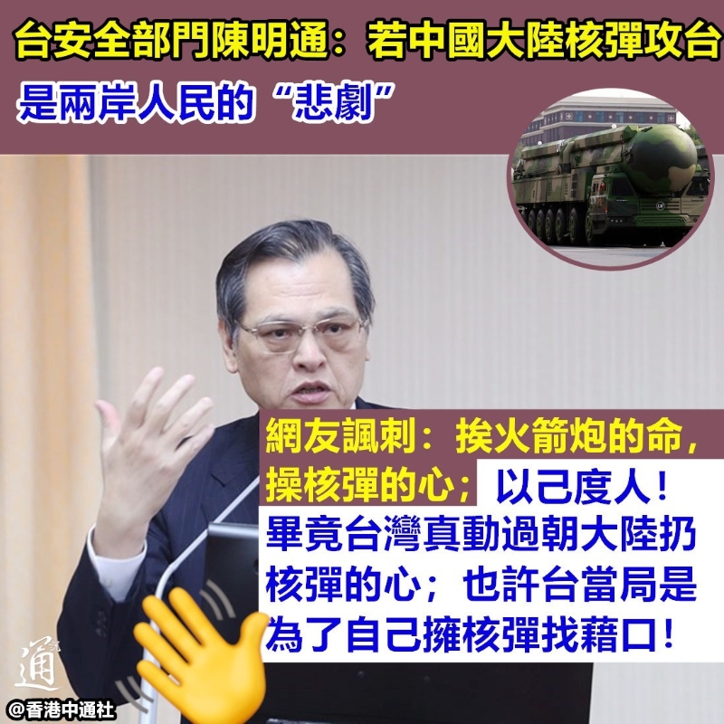 (圖源:香港中通社) 近日,台灣地區領導人蔡英文等不斷挑釁大陸,致使兩岸情勢緊張。國民黨“立委”江啟臣今日(4日)就拿美方最新報告,詢問台安全部門負責人陳明通,“假如中國大陸攻台,是否可能動用核武?” 據島內綠媒報道,台“立法院”“外交及國防委員會”今日邀請陳明通就台安全部門明年度預算“秘密報告”公開詢答,江啟臣引述美國報告稱“大陸在2027年將有700枚核彈頭,2030年將有1000枚核彈頭”,詢問陳明通“這些核彈頭針對誰?” 江啟臣又追問道,“假如中國大陸攻台,是否可能動用核武?”台安全部門的專業評估為何? 對此,陳明通聲稱,“如果發生這種事情,是兩岸人民悲劇”,又抹黑“以戰逼和”一直是中國大陸的“劇本”。 不過,江啟臣隨後亦承認,就算大陸要“以戰逼談”也無需動用700枚核彈頭。但陳明通顯然不會放過這個抹黑大陸的“好機會”,不斷強調稱“中國大陸白紙黑字說要統一台灣……這就是衝著我們而來。”他叫囂“台灣不畏戰”,要持續強化台灣的防務力量。 先是美國不厭其煩地炒作中國“核威脅”,現在又輪到民進黨當局“被迫害妄想癥”發作、臆測大陸會否動用核彈襲台…… “殺雞焉用牛刀?”“挨火箭炮的命,操核彈的心!”對於台政客隨美起舞,炒作中國“核威脅”的舉動,不少網友諷刺稱,民進黨當局是“以己度人”,畢竟台灣真動過朝大陸扔核彈的心。