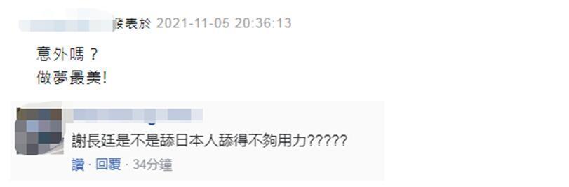 還有人諷刺,“意外嗎?做夢最美!”“謝長廷(台當局‘駐日代表’)是不是舔日本舔得不夠用力?”
