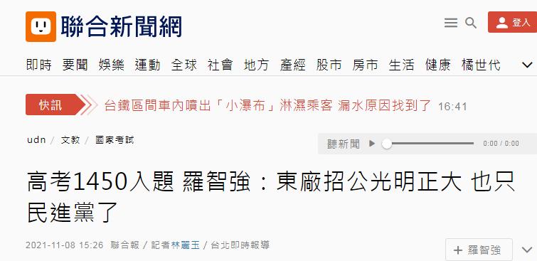 島內公務員考試“1450”入題,台議員:東廠招公這麽光明正大,只有民進黨據台灣《聯合報》報道,台北市議員羅智強8日在臉書貼出今年台灣公務人員高考三級“民意與公共關係學概論”試題,對於今年的考題將“1450(指民進黨網軍)”、“萊豬”入題,羅智強批評民進黨,“東廠招公招得這麽光明正大,也只有民進黨了。”