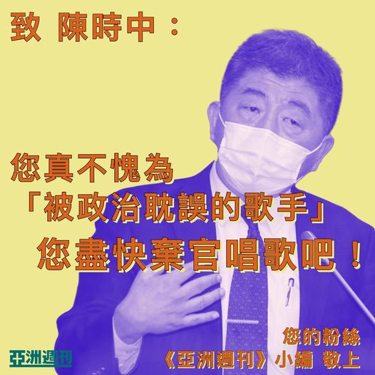 陳時中酒桌視頻瘋傳攪動台灣,香港《亞洲周刊》出手了台“衛福部長”陳時中一段參加宴會未戴口罩飲酒高歌的視頻在社交媒體上瘋傳,引起各方批評。11日,香港《亞洲周刊》在臉書上給陳時中發了一封公開信,並諷刺他為“脫罩歌王”。 《亞洲周刊》在公開信中稱,小編被您(沒戴口罩的)動人歌聲所打動,您真不愧為“被政治耽誤的歌手”,希望您盡快棄官唱歌,不要再耽誤大家的時間。