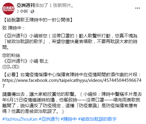 《亞洲周刊》臉書圖片 在文中,《亞洲周刊》還貼出“陳時中在疫情期間飲酒作樂”的相關視頻鏈接,寫道:請廣傳出去,讓大家能欣賞他的歌聲。 隨後則是一段“小編按”:陳時中聲稱本片是去年6月15日疫情趨緩時拍攝,他餐敘時——沒帶口罩——唱完兩首歌就離開了,貌似違反了防疫規定,這種“防疫意識”是防疫指揮官應有嗎?他真的是被政治耽誤了。