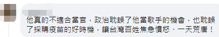 “他真的不適合當官,政治耽誤了他當歌手的機會,也耽誤了採購疫苗的好時機,讓台灣百姓焦急憤怒、一天荒唐!”有網友寫道。