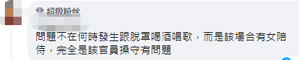 還有人稱,“問題不在何時發生跟脫罩喝酒唱歌,而是該場合有女陪侍,完全是該官員操守有問題。”