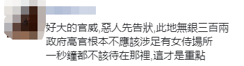 還有網友不滿表示,“好大的官威,惡人先告狀,此地無銀三百兩,‘政府’高官根本不應該涉足有女侍場所,一秒鐘都不該待在那裏,這才是重點。”