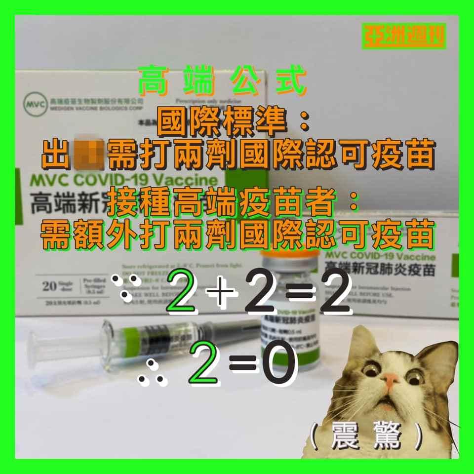 值得注意的是,香港《亞洲周刊》也給台灣民進黨補了一刀! 11月15日,《亞洲周刊》在臉書發帖嘲諷稱,按照國際標準,出境需打2劑國際認可疫苗;接種高端疫苗者,則需另外打2劑國際認可疫苗,據此可得出“高端公式”——因為“2+2=2”,所以“2=0”。 對於台灣的疫苗策略變政治炒作,但仍無法改變高端未被國際認可的事實,綠營卻成功化“2”為“0”,《亞洲周刊》小編表示,“可以幫蔡英文政府申請競逐諾貝爾數學獎嗎?”並在評論區留言寫下,“世界都跟不上台灣”、”跟不上了,(台灣)難波萬(NO.1)!” 有島內網友揶俞稱,這是“超前部署!”美日各國都在預備打第3針,台“衛福部”已指示打4針……