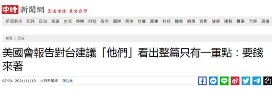 美國國會中的一個反華小組、美國國會下屬美中經濟與安全審查委員會近日炮製539頁報告鼓吹嚇阻中國,叫嚷對台軍售。消息傳到島內,台灣“中時新聞網”19日稱,此報告對台建議引起許多島內網友關註,不少人直言,整篇報告只有一個重點,就是要錢來著。