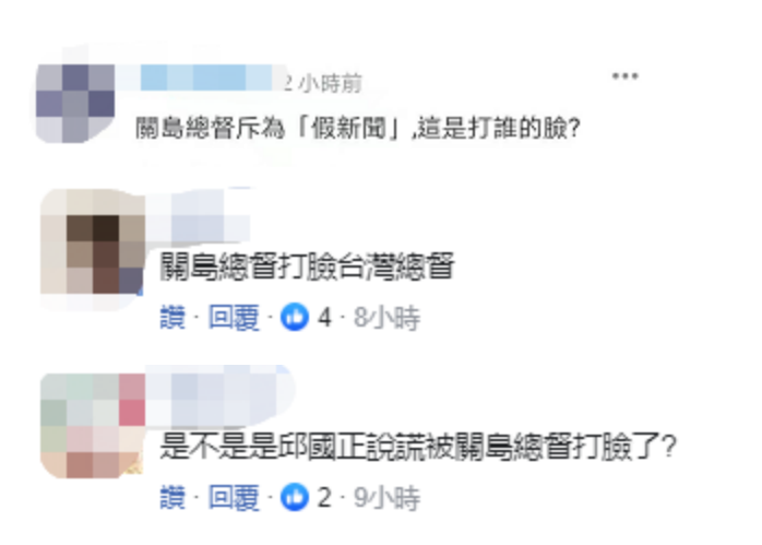 也有網友留言譏諷,“關島總督斥為‘假新聞’,這是打誰的臉?”“關島叫督打臉台灣總督”;“是不是邱國正說謊被關島總督打臉了?”