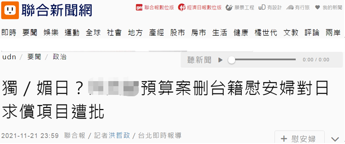 台灣《聯合報》報道截圖 據台灣《聯合報》報道,台外事部門過去在年度預算案編都列有協助“向日本索償各項債權及‘台籍慰安婦受害人’補償費”,2021年還保有相關追償所需預算,但2022年同一預算項下,這項“台籍慰安婦受害人”追償已被取消,成為“補助民間團體辦理索償經費”。 國民黨“立委”陳以信批評,預算案中“補助民間團體辦理索償經費”的說法,非但無法涵蓋“台籍慰安婦受害人”補償費,“只有民間,沒有政府”,顯示“政府”為受害“慰安婦“對日求償的立場已然鬆動,這是一件錯誤。 陳以信進一步表示,民進黨當局宣稱追求“轉型正義”,不應放棄對日爭取受害者的權益,則形同對台灣人不正義,對不起這些當年受害的台灣“慰安婦”。 民進黨“立委”羅致政則辯稱,預算案文字的轉變不盡然即代表“政府”政策有所轉變,而台日關係面向多元,相信“外交部”在預算審查時會作解釋。 台外事部門對此給出的解釋是,2022年預算項目“補助民間團體辦理索償活動經費”是整合各項對日本求償相關經費名目的統稱,實際內容仍包含辦理“慰安婦”、台籍日本兵及對日債權等歷史求償案件,“今後將持續補助相關民間團體活動,提昇國際社會對此案的關註”。 報道稱,日本在二戰時期強征台灣“慰安婦”上戰場,馬英九執政時期曾全力支持婦團協助“慰安婦”對日求償,但並不順利,在日判決始終不利台方,但“政府”持續補助婦團爭取對日求償。 對於台外事部門預算案刪除為“慰安婦”爭取權益的字樣,台灣《聯合報》質疑民進黨當局“媚日”,也有島內網友想起了“媚日代表”謝長廷。↓