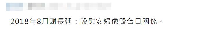 台灣的“慰安婦”銅像由國民黨台南市黨部在2018年8月14日主導設置。但時隔一周後,台“駐日代表”謝長廷在社交網站發文,以中文、日文暗指國民黨不斷擴大“台日矛盾對立”,設置慰安婦銅像、發起禁止進口日本食物的投票,作用在於破壞“台日關係”,認為這“令人憂慮痛心。” 謝長廷的言論在島內引發議論,有學者和政界人士質疑他已經變成“助日代表”、“媚日代表”,甚至要加入日本籍。