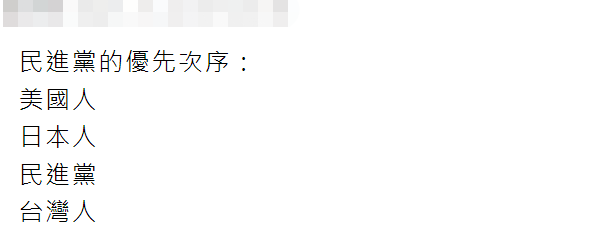 還有網友為民進黨當局的優先次序排了序:美國人、日本人、民進黨、台灣人。↓