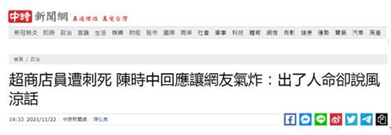 據台灣“中時新聞網”消息,桃園21日清晨發生超市店員因勸導戴口罩被顧客持刀刺死的案件,台“衛福部長”陳時中今天(22日)就此事回應時聲稱,“勸導配戴口罩不是一般民眾的責任”,島內網友聽完這話痛批陳時中,“說的是人話嗎,規定都是你們在說的,出了人命卻說風涼話”。