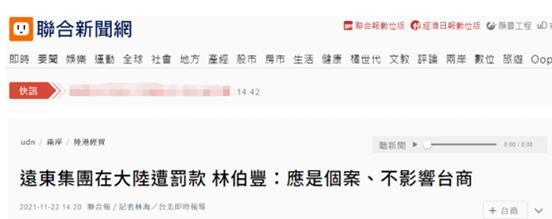台灣“聯合新聞網”報道截圖 據報道,對於在大陸被罰款,遠東集團方面目前仍未回應,而遠東集團旗下水泥企業“亞洲水泥(簡稱亞泥)”表示,目前還在瞭解狀況中。