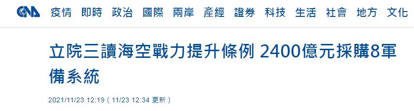 台灣“中央社”報道截圖 據報道,台立法機構“外交及國防委員會”、“財政委員會聯席會議”10月6日初審通過“海空戰力提昇計劃采購特別條例”草案;然而,關於8項采購項目、5年2400億元新台幣經費等5條關鍵條文,在場“立委”討論後未達成共識。
