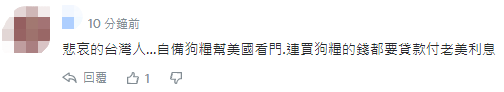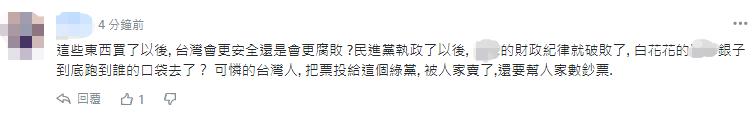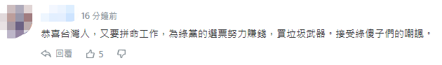也有網友諷刺:台灣人又要拼命工作,為民進黨的選票努力賺錢,還要買垃圾武器。↓