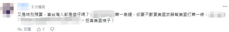 還有網友直斥:又是“特別預算”,當台灣人都是盤仔(肥羊)嗎?拒當美國棋子!↓