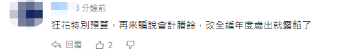 另有網友認為,“(民進黨當局)狂花特別預算,再來騙說會計剩餘,改全編年度歲出(財政支出總和)就露餡了”。↓