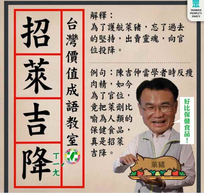 陳吉仲稱豬吃萊劑好比人吃保健食品,遭台灣民眾黨諷刺“招萊吉降”。(圖片截民眾黨臉書) 據了解,2013年2月,當時任台灣中興大學教授的陳吉仲說,2012年談瘦肉精美牛進口時,外界就預期美豬開放壓力,(馬英九)政府當初以“牛豬分離”說服豬農與民眾。如果政府違背諾言,要不要有人下台負責?如開放瘦肉精美豬進口,後果很嚴重,政府“打死也要擋”。 台灣《聯合報》評論稱,陳吉仲身為“農委會”主委,能如此賣力為進口豬肉辯護,台灣豬農點滴在心頭。學者從政掌控權力後的前後轉變,豈不令人錯亂?連自己說過的話都能否認,不是太想贏公投,就是太過健忘。 而面對外界批評,陳吉仲11月23日晚間在臉書發文“喊冤”稱,沒說過萊劑是人類的保健食品,請相關人士勿扭曲解釋,並貼出受訪逐字稿。 民進黨“立法院”黨團今天(11月24日)也跳出來說,這是誤會,陳吉仲用詞遣字不夠精準,他的意思是添加物在美國合法使用沒問題。 反萊豬醫師蘇偉碩則表示,陳吉仲逐字稿“我們也看過,妳就是把它比喻成人的保健食品,我們沒誤會妳”。 【編輯:石欢欢】