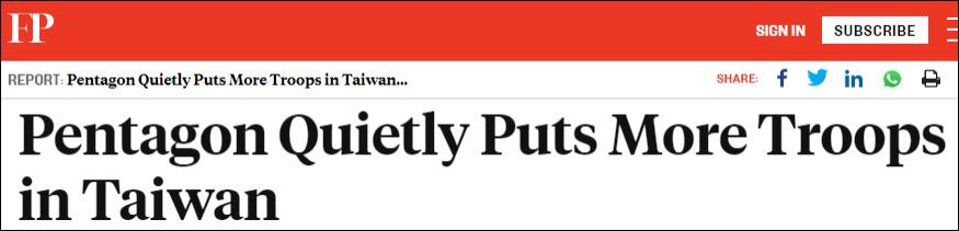 《外交政策》報道截圖 《外交政策》援引美國防部人力數據中心最新資料,稱美國目前有39名士兵在台灣,包括29名海軍陸戰隊員、5名空軍士兵、3名海軍士兵和2名陸軍士兵。 根據美國防部數據,奧巴馬政府晚期到特朗普政府早期,約有10名美軍在台灣,這一數字在特朗普離任時增加了一倍。到了今年6月,美軍有30名現役軍人以及15名文職人員在台灣,其中包括23名海軍陸戰隊員,而最新的在台美軍數字與之前相比又有增加。文職人員數量大致不變,維持在15人左右。 報道稱,美國防部人力數據中心的數字可能無法反映全部美軍在台人數,例如無法核實其中是否包括在台訓練的美軍特種部隊。 《外交政策》指出,美軍在台灣的作用似乎也在擴大,美國海軍陸戰隊通常被部署在世界各地協助保護美國“大使館”的安全,而數十年來悄悄進出台灣的美軍,則協助訓練台軍使用美方售台武器。但過去兩年,在美國前國安顧問博爾頓的大力遊說下,美軍開始“發揮更積極的作用”,包括協助台灣“為擊退大陸兩棲攻擊做準備”,以及訓練台軍進行“陸上武裝抵抗”。 據台灣“中時新聞網”報道,對於美媒報道台灣地區美軍數量增加一事,台防務部門11月24日聲稱,美國依照所謂“台灣關係法”及“對台六項保證”,協助台軍“強化防衛能量”,確保台海及區域的和平安全,雙方有“長久的安全合作關係”。至於細節,台防務部門不做任何評論。 近期美國和台當局頻頻渲染“駐台美軍”問題。今年8月,美國會參議院共和黨資深議員約翰·科尼在推特聲稱,美國在台灣有3萬駐軍,攪動一波輿論後又刪除帖文。10月7日,美媒《華爾街日報》引述多名匿名美國官員的消息稱,有小股美軍至少已在台灣部署一年,負責訓練台軍。10月27日,美國有線電視新聞網(CNN)播出的專訪中,台灣地區領導人蔡英文首次承認有美軍以訓練為目的駐紮在台灣。 《外交政策》稱,美國一些鷹派人士希望拜登政府能在公開支持台灣方面采取更強硬的立場,美國軍方和文職官員前不久對台進行所謂的“訪問”,以此來顯示某種姿態。但一些人也擔心,向台灣增派美軍可能會不必要地讓五角大樓承擔起“保衛台灣”的責任,進一步擴大美軍規模,也違背拜登政府想讓更多美軍從海外衝突中撤回的願望。 美國退伍軍人團體“共同防禦(Common Defense)”聯合創始人亞歷山大·麥考伊(Alexander McCoy)表示:“現實情況是,美國民眾不願也不會支持就台灣問題與中國開戰……這些對台灣問題持鷹派態度的國會議員,正用他們虛弱的撲克手在牌桌上虛張聲勢,把我們的生命當籌碼,這太蠢了。” 對於蔡英文證實有美軍存在於台灣,外交部發言人汪文斌10月28日表示,我們堅決反對美方同台灣地區進行任何形式的官方往來和軍事聯系,反對美方幹涉中國內政。美艦近來多次在台灣海峽“大秀肌肉”、挑釁攪局,向“台獨”勢力發出嚴重錯誤信號,威脅台海地區和平穩定。是誰在台灣問題上搞“脅迫”,國際社會看得很清楚。 汪文斌指出,搞“台獨”是死路一條,支持“台獨”也是一條不歸路。任何國家、任何人都不應低估中國人民捍衛國家主權和領土完整的堅強決心、堅定意誌、強大能力,否則必將再次遭到失敗。 【編輯:俞丹凤】