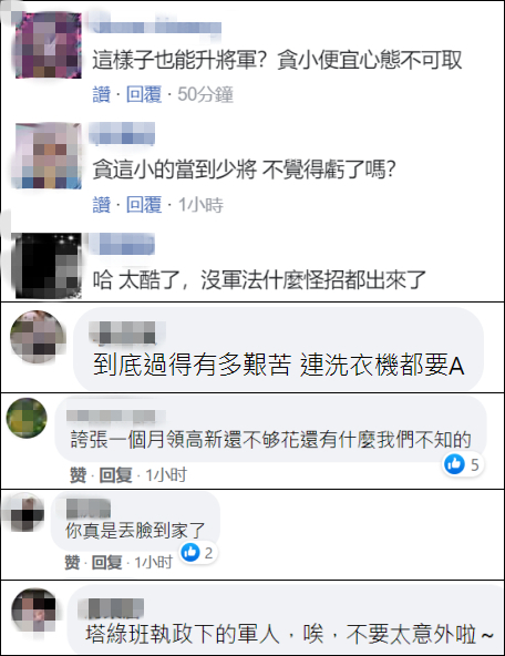 台軍醜聞又曝新細節。綜合台灣“中時”新聞網、“ETtoday新聞雲”等媒體11月24日報道,此前因挪用公費接受調查的前“金門防衛指揮部參謀長”林帝誌(“少將”),除了不實報銷經費外,還侵吞包括辦公室花瓶在內的公物,甚至連洗衣機都不放過,從金門“跨海”寄回台南家中。 消息一出,台網民紛紛留言諷刺:“到底有多艱苦,連洗衣機都要貪”“真是丟臉到家了”“什麽牌子這麽好用,不惜犯法都要拿回家”。