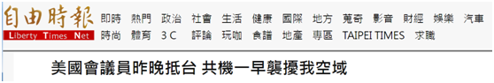 台灣省綠媒《自由時報》聲稱,“共機”持續“襲擾”台灣西南空域,11月連續擾台未中斷,美眾會議員25日晚間抵台“訪問”,今天(26日)上午一早“共機”再次進入台灣西南空域,“嗆聲”意味濃厚。