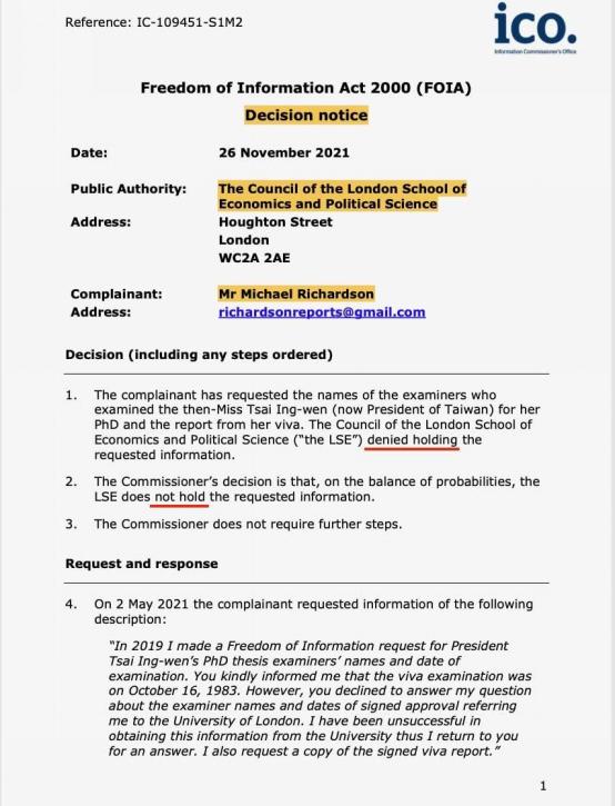 台灣“雅虎新聞網”報道截圖 林環墻28日在臉書以發文提到,相關判決文是由ICO資深個案調查官叩松(Roger Cawthorne)所簽署,內容主要提到,LSE校評會否認持有當時蔡英文的博士論文口委及口試報告。