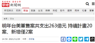 據台灣中時新聞網29日報道,台灣明年度防務預算在台美軍售案支出方面,共編列約263.3億元(新台幣,下同),其中持續執行計劃20案約251億元,新增2案近12億元。此前,針對民進黨當局企圖以武獲“獨”、以武拒統,國台辦發言人馬曉光曾表示:以武拒統,死路一條。