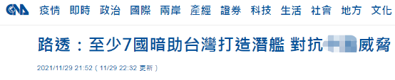 台灣“中央社”報道截圖 報道引述路透社消息稱,“台灣潛艇自造計劃已從至少7國手中取得技術、零件與人力援助”。