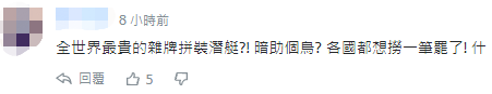 留言截圖 (原標題:外媒曝英美七國秘密幫台灣造潛艇,網友:全世界最貴的雜牌拼裝,都想撈一筆!) 【編輯:胡雪石】