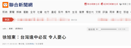 徐旭東投書台灣《聯合報》報道截圖 徐旭東稱,台灣許多機構進行針對台灣人對於兩岸關係的調查,其中“維持現狀”是最多數台灣人主流民意;他跟多數台灣人一樣,希望兩岸關係“維持現狀”,“更一向反對台獨”,並支持“九二共識”,也支持一中原則。 徐旭東還稱,台灣近年“逢中必反”似乎有擴大跡象,也令人憂心。近來兩岸政治進入零互動、關係急凍,但兩岸經貿往來卻愈來愈熱絡。 對於徐旭東投書表態反對“台獨”,有島內網友表示,“哈!徐董又打臉民進黨啦!”↓