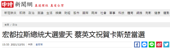 台灣《自由時報》報道截圖 據台灣“聯合新聞網”報道,洪都拉斯11月28日舉行總統大選,反對黨候選人希奧瑪拉·卡斯特羅當日宣佈勝選、這意味著她將成為洪都拉斯首位女性總統,並終結現任執政黨12年的執政。此外,洪都拉斯執政黨候選人阿斯富拉當地時間11月30晚承認敗選,並恭喜對手卡斯特羅為“總統當選人”,並到其住處拜訪。美國國務院也匆忙示好,發祝賀聲明,聲稱期待與新政府合作。