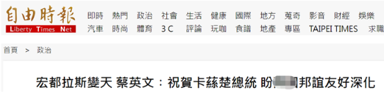 洪都拉斯大選官方結果尚未公佈,蔡英文的祝賀已經到了。 “中時新聞網”“中央社”等多家台媒1日稱台“友邦”洪都拉斯大選“變天”,反對黨候選人希奧瑪拉·卡斯特羅已宣佈勝選,該國執政黨候選人納斯裏·阿斯富拉承認敗選。台“總統府”今日稱,蔡英文誠摯祝賀“友邦”洪都拉斯總統大選由卡斯特羅順利當選,期盼雙方“邦誼”持續友好深化雲雲。由於在競選中卡斯特羅曾表示勝選後將與中國大陸建交,與台灣“斷交”,有島內網友諷刺道蔡英文:“皮繃緊一點,等著‘斷交’吧?”