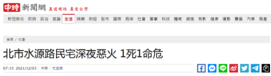 台灣“中時新聞網”報道截圖 據報道,台北市消防局在3日凌晨2時58分獲報在水源路有火災發生,立即派遣55名消防人員及20輛各式消防車輛趕往現場搶救。