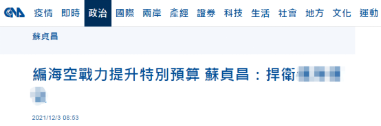 台灣“中央社”報道截圖 蘇貞昌聲稱,大陸持續擴張軍事力量,近期軍機“繞台”、船艦“侵擾”不斷,針對性的演訓活動比起往更加頻繁。他還聲稱,大陸對台灣的“威脅”與日俱增,在面對此嚴峻“敵情”下,“惟有展現自我防衛決心並付出努力”。