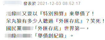 台軍今年9月“漢光演習”。圖源:台灣“聯合新聞網” 蘇貞昌宣稱,特別預算案是所謂的“重大國防投資”,他還呼籲各“立委”全力支持,早日通過此特別預算案。 然而,國民黨團書記長陳玉珍2日受訪時就對此表示質疑,並批評“不要用‘抗中保台’的大帽子任意揮霍”。 陳玉珍表示,該預算案有空白授權、違反財政紀律的疑慮,台“中科院”在2014年至2020年期間,有36家得標廠商董監事跟現在“中科院”35名現職員工互為配偶跟親屬等關係,質疑“中科院”是否能符合“採購法”的精神,“有相當大的疑慮”,並稱希望民進黨當局不要用“抗中保台”的大帽子,任意揮霍國家公幣,也不要再用行政不中立的方法宣傳“公投”, “偷人民的納稅錢來洗人民的腦”。 對於蘇貞昌這番為加大軍購力度的背書,有島內網友表示:民進黨又要以“特別預算”來舉債了。↓