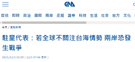 “自己惹出問題,現在想拖全世界下水?”12月3日,台灣“中央社”的一篇報道令島內網友發出這樣的疑問。 “中央社”報道稱,新加坡“亞洲新聞台”(CNA)採訪多名專家、學者及台當局“駐新加坡代表”梁國新,專題探討“台海戰爭的可能性”,節目於2日晚播出。 梁國新在節目中聲稱,台海情勢不僅對台灣、對亞洲,甚至對全世界都是“非常重要的議題”。若台海發生衝突,這不僅是兩岸雙方的事。至於兩岸是否會發生戰爭,梁國新宣稱,如果全球國家不關注台海情勢,如果認為這是“中國的問題”,就可能發生戰爭。